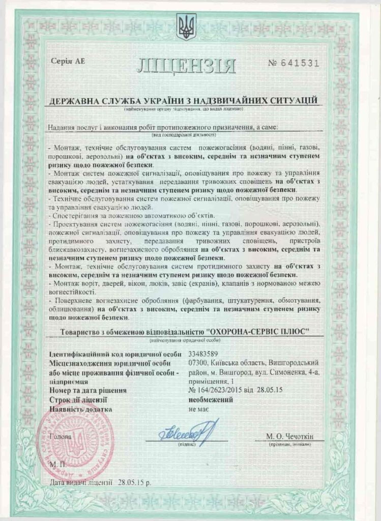 У 1994 році ми отримали ліцензію на надання послуг і виконання робіт протипожежного призначення. Це дозволяє нам виконувати роботи будь-якої складності і гарантує нашим клієнтам високий рівень безпеки.